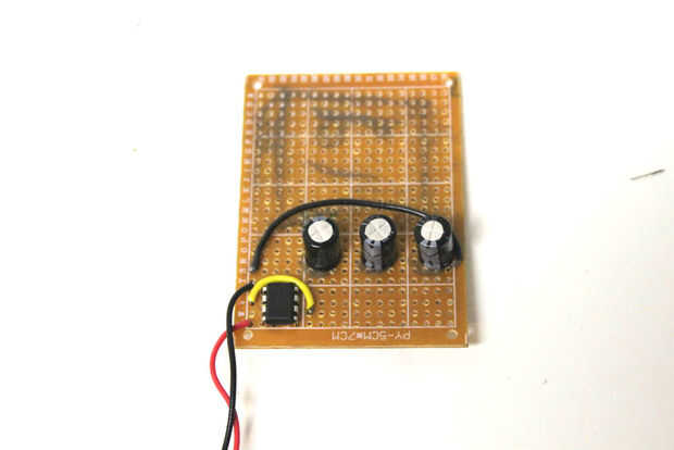 Por fin, podemos empezar a añadir componentes para hacer el robot real! Permite comenzar con los condensadores. Coloque los condensadores en los tres "botones" en el robot de instructables. En el condensador más cercano a los 555, curva su más (positivo) pin 2 o 6 y conecte la otra punta al siguiente condensador ya plomo (positivo). Conecte al segundo otro cable del condensador del condensador pasado más largo. Luego conecte del condensador final más corto a tierra. Para conectar el condensador a tierra, utilice un cable negro para formar el torso del robot.