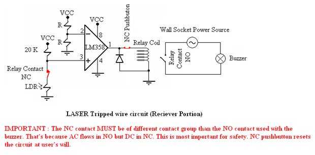 aprender a construir un tripwire láser y alarma de presión circuitos. Se construirán dos circuitos: el circuito de tripwire láser y el circuito de alarma. La alarma es un oscilador muy simple de dos transistores que se conecta el relé en el circuito