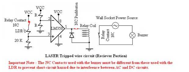 aprender a construir un tripwire láser y alarma de presión circuitos. Se construirán dos circuitos: el circuito de tripwire láser y el circuito de alarma. La alarma es un oscilador muy simple de dos transistores que se conecta el relé en el circuito