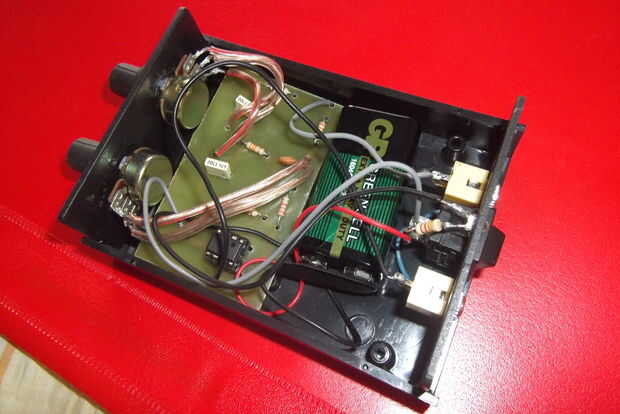 poner los elementos en el tablero, enlazan a los potenciómetros, batería, entrada, salida y el encendido apagado interruptor y luego poner la placa en una caja. Fijar potenciomettre de entrada y salida interruptor en la caja, conectar cualquier batería, cerrar la caja y listo hacer este circuito! buena suerte :)