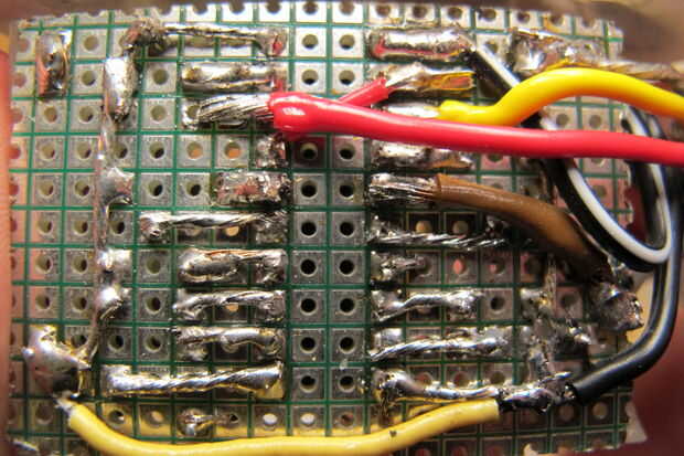 La segunda foto muestra el corte final de circuito, con los cables de salida soldados desde el lado de botom. Amarillo y rojo son el channesl y escudo es el suelo.