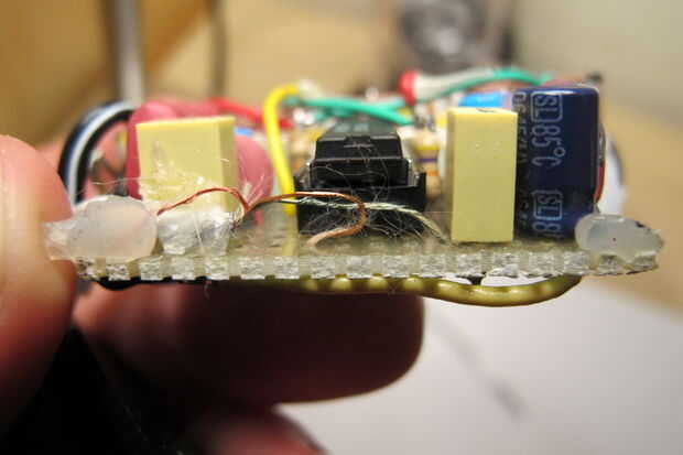 En la tercera foto se pueden ver los diminutos cables de entrada. Realmente estos provienen de un antiguo conjunto de auriculares que es bueno como el jack de 3,5 mm ya existe y no es necesario soldarlo.