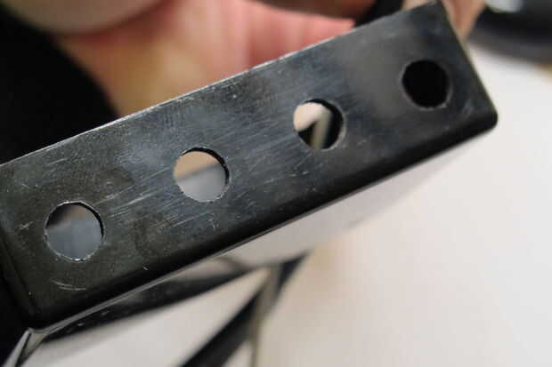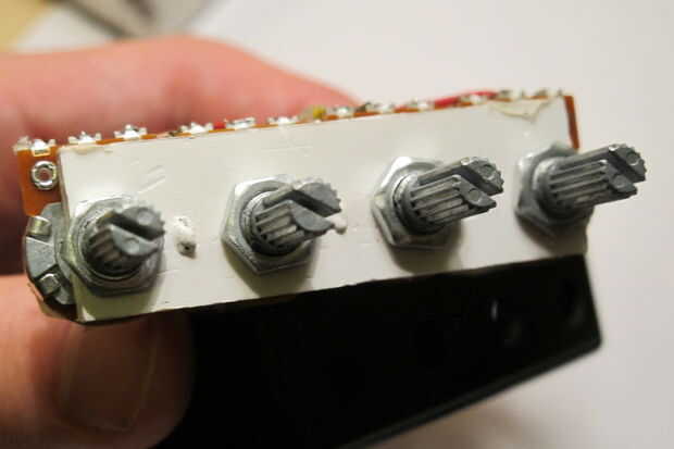 Probablemente querrá poner los potenciómetros en un lado de la caja que utilizas. He utilizado una caja de plástico que es el mínimo tamaño para mi pcb. Cuatro agujeros perforados en la parte delantera para poner a través de ellos los ejes del potenciómetro. Todos los potenciómetros son apretados en un pequeño trozo de plástico dentro de la caja negra.