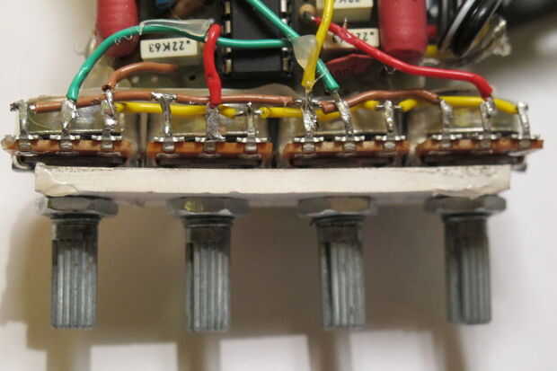 Nota: Dos de los pernos de los tres potenciómetros de ejecutan en paralelo, así que puede ahorrar algunos cables haciendo puente-como los cables.