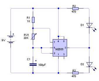 hice esto como un proyecto rápido usar mucho los LEDs tengo recientemente. Básicamente se conecta vía un 555 8 pin IC y permite ajustar el tiempo entre el tapajuntas cambiando los valores de resistencia o condensador. Proporciona un fresco buscando e