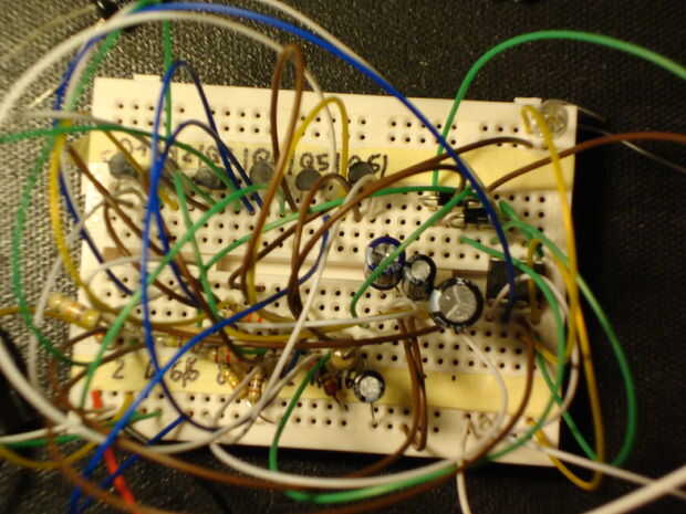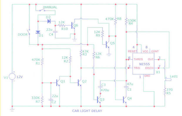 Accionando el pulsador manual o abriendo la puerta Q2 se enciende por un instante para conducir la salida a nivel alto: enciende la luz. Si se activa el interruptor manual o la puerta está abierta Q3 mantiene en y la corriente fluye a través de C3: la luz retrocede después de 3 minutos.