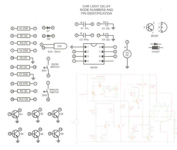 Cerrando la puerta Q3 y Q5 interruptor apagado, mientras que Q4 se enciende. Así que la corriente fluye a través de C1 y la luz retrocede después de 15 segundos.