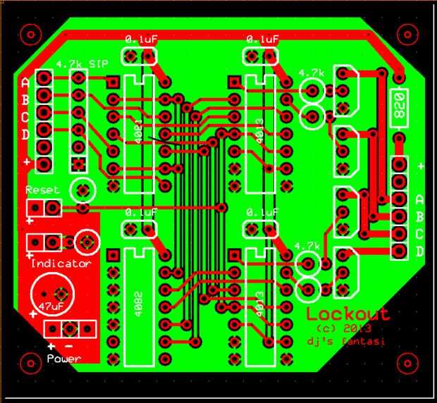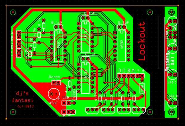 El diseño para crear el PCB está por debajo. Hay también adjunto una foto de un diseño mejorado que desarrollé. Puse manualmente el circuito impreso con el ExpressPCB. La primera que se muestra es la que realmente usado en la construcción. El segundo es una foto de un diseño mejorado, donde mediante el uso de pernos ligeramente diferentes, pude crear un trazado ortogonal, simplificando el cableado. Tenga en cuenta que en la versión 2, he usado un resistor de k 7 4 SIP en lugar de componentes discretos.