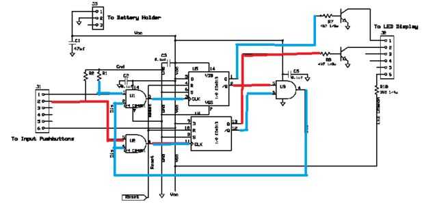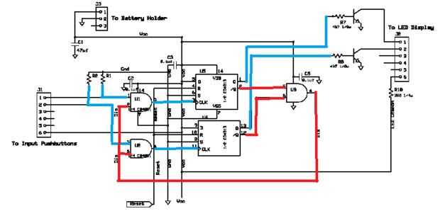 El corazón del circuito es una puerta AND, conectar el pulsador a la entrada de reloj del flip flop D tipo. El flip flop está conectada como monoestable cerrojos, lo que significa que una vez que se cierto, sólo un reset puede cambiarlo nuevamente. La entrada Set del flip flop está ligada a la tierra, como no se utiliza. La entrada de datos está ligada a Vcc (+ 9vdc).
