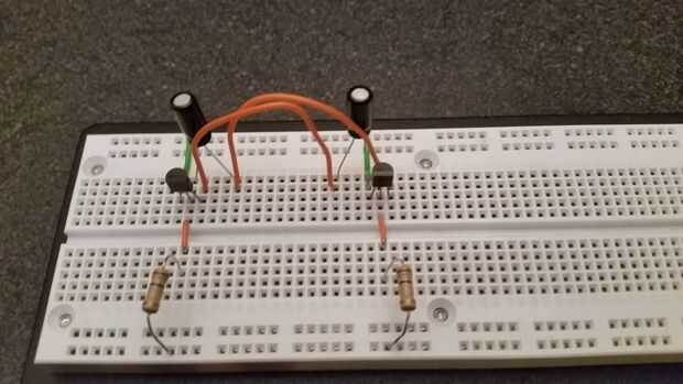 A continuación, conecte las resistencias de 100 k a los transistores. Uno de los cables de la resistencia se conecta a la Base del transistor, el otro cable se conecta a tierra. Hacer esto para ambos transistores.