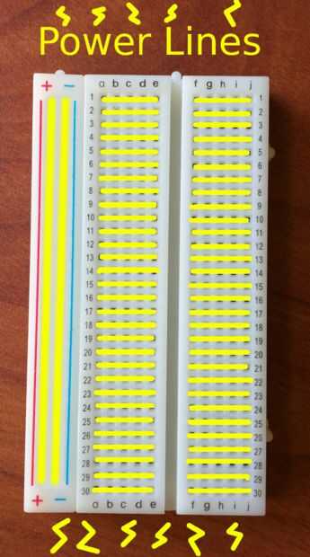 He arriba pintado los carriles conductores sobre una foto de la Junta de pan. Aviso actual sólo se lleva a cabo a lo largo de las filas y luego no se realiza entre las dos mitades del tablero. Esto significa, si se construye un circuito completo, los conductores de algunos componentes deben estar en la misma fila como algunos otros componentes.