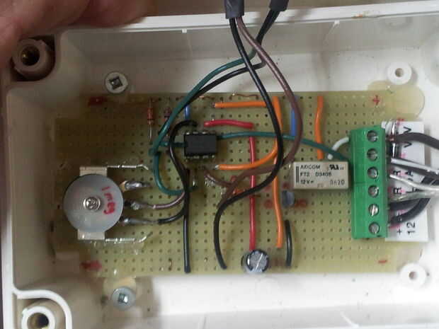 Nota! Tomó un tiempo para averiguar, pero es muy importante poner un 1N4007 o igual diodo (ánodo a 0V) a través de la válvula que no se muestra en el esquema. Para mí, el arranque eléctrico de la válvula había alimentado hacia el chip 555 y lo había desordenado.