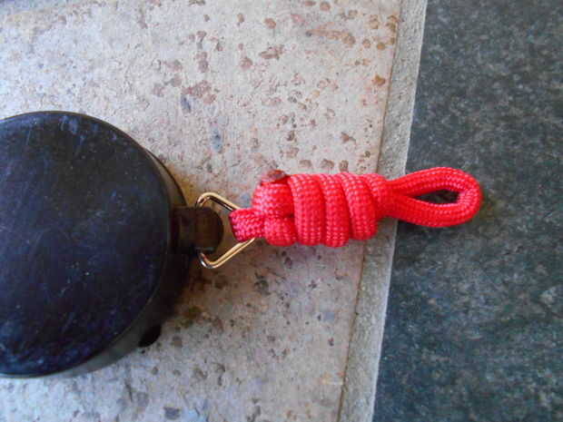 Felicitaciones, ahora tiene un dispositivo de tipo nudo de doble lazo a un lado paracord. Puede conectarlo a mosquetones, s-mosquetones, cualquier cosa con un agujero del acollador, alrededor de algo sin un agujero de cordón, para su uso como un accesorio de la gota de la pierna, o lo que quieras usarlo para. Fin.