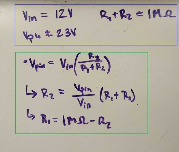 Así que ahora que tenemos un valor objetivo conocido (nuestro ~2.3V determinó en el paso anterior) y el valor de entrada de 12V, podemos hacer un poco de matemáticas para determinar los valores de resistencia que deberá satisfacer el circuito de funcionamiento con estas tensiones. Diseñé este circuito por lo que la resistencia total sería aproximadamente 1 MΩ (similar a la impedancia de un multímetro típico).