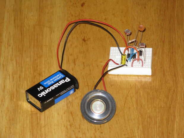 Sin embargo si usted toma este circuito fuera en el sol todo que se obtiene es un gimoteo de alta echada fuera de él a menos que cubra completamente las resistencias de la foto. El circuito no funciona que fue diseñado que está sobrecargado por la luz, el sol rebota todo a tu alrededor a la mano para las resistencias de la foto.