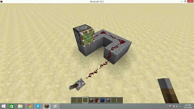 Coloque la palanca y pistón como se muestra. Haga clic en la palanca para comprobar si el pistón pegajoso está conectado correctamente a la redstone.