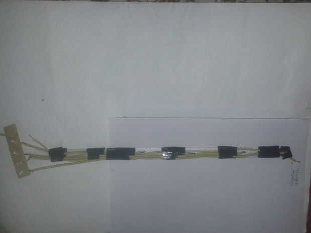 Si nos fijamos en segundo snap shot (este es de la vuelta parte) verás que lo he arreglado un alambre más que no está conectado con cualquier cosa en ambos extremos. Este cable he montado porque van a proporcionar la fuente de energía negativa a través de él. El fin último en la parte inferior es ligeramente más largo que la longitud entera de la tira de vidrio.