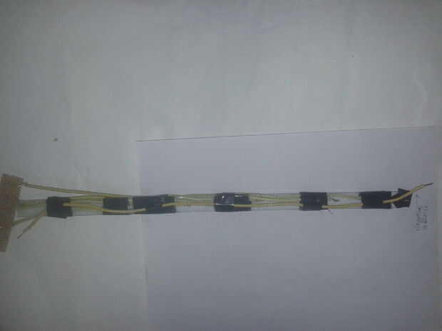 He utilizado la tira de vidrio pequeño y su longitud es igual a la longitud del alambre del alambre más largo que sale de la terminal negativa de uno de los led (este es el cable que indica nivel de 1/4.) y todos los cables en él mediante el uso de cinta aislante negra en la tira de vidrio.