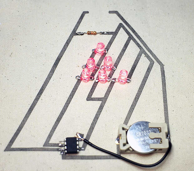 Contorno suave es cuando se utilizan materiales blandos de conductoras (hilo, tela, lana, etc.) y circuitos de arte utilizando técnicas de costura y componentes electrónicos.