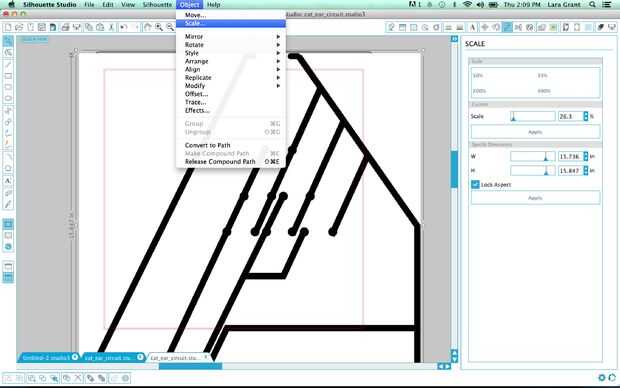 -Para cambiar la escala, haga clic en seleccionar archivo, vaya a objeto > escala y el tipo en sus dimensiones. Esto no es ideal, especialmente si usted está haciendo trabajo fino que necesita alinear con pequeños componentes. Por favor deja un comentario si sabes como importar archivos y guardar las dimensiones guardadas!