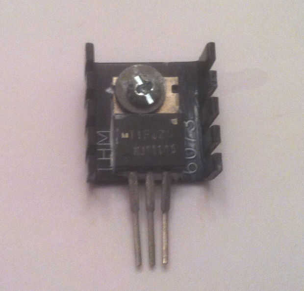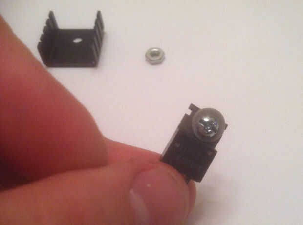 Esta fabricación es bastante sencillo. Aplicar algún compuesto disipador de calor para el transistor (primera imagen de esta serie) y luego poner la arandela de nylon en el tornillo de en y a través del transistor (segundo). El compuesto aumenta la conductividad térmica, que ayuda en el proceso de disipación. Por último, sujete la tuerca en la parte posterior del disipador de calor.