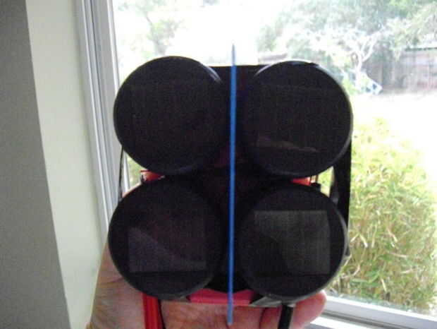 La mejor manera de utilizar las dos células PV como un goniómetro es exagerar la cantidad de luz que incide en el uno contra el otro cuando las células están al lado pero no apuntando directamente al sol. La manera estándar de hacer esto es poner a algún tipo de separador entre ellos como un pedazo de tarjeta, apuntando a remite, que proyecta una sombra cuando la fuente de luz está a un lado pero que ninguna sombra pertinente cuando la luz está directamente en frente de los equipos.