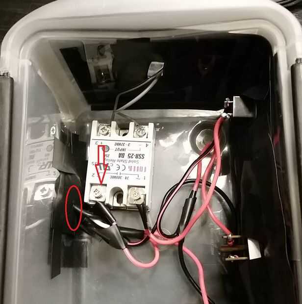 •El siguiente paso es soldar el cable a tierra de cable (macho) 120V AC al conector (hembra) de 120V. El cable positivo desde el cable (varón) de la CA 120V es soldado a dos conjuntos separados de hilo de 20g. Usé el rojo porque es la conexión positiva. Necesita tener dos juegos de cables procedentes de lo positivo, porque se conectará a dos lugares separados, como se muestra en el esquema. •Usted puede conectar uno de los cables de 20g que está viniendo desde el cable (varón) de 120V AC a la conexión de ~ 2 SSR (rele de estado solido). Esto se muestra en la imagen.