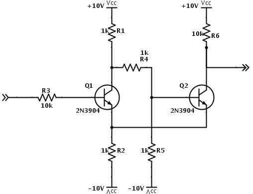 Por otro lado, supongamos la señal de entrada disminuye ocasionando la corriente de base (Ib) y corriente de colector (Ic) de Q1 lo hagan también. Habrá un punto donde el voltaje de la señal de entrada estará cercado al limite inferior (un valor realmente bajo) lo provocará se genere una diferencia de potencial entre la base y el emisor activando Q2 dejando fluir corriente del emisor y a través de R2 haciendo el voltaje de emisor de Q1 que, at consecuencia igualará al voltaje de base provocando menos corriente fluya a través la de de este transistor y la base de Q2 crezca. En cierto punto Q1 con de conducir para darle el paso a Q2, reacción casi simultanea.