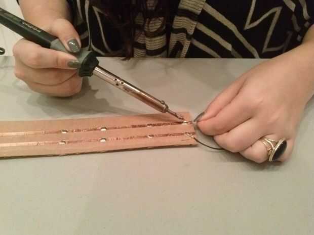 Tome el cable negativo y sostenga los alambres expuestos contra el punto de soldadura. Este punto con su soldador de calor hasta que cubra el alambre.