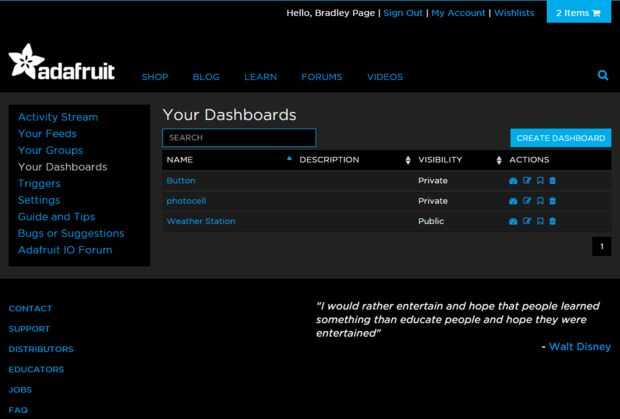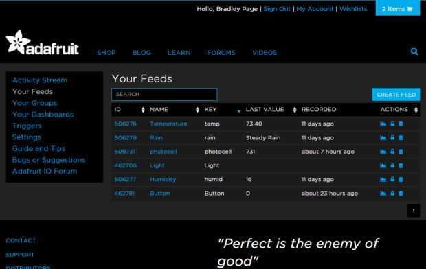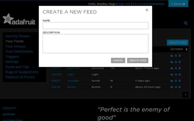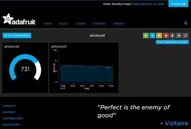 Usted necesitará una cuenta en https://io.adafruit.com. Una vez que tenga, verá un panel por defecto con algunos bloques de panel de control ya configurado para usted. Haga clic en el enlace de mis cuadros de mando de la izquierda para llegar a la pantalla principal. Desde aquí usted desea haga clic en mis FEEDS y crear un nuevo feed llamado fotocélula. Haga clic en el enlace de la izquierda para volver a la Página principal de nuevo alimenta mi. Haga clic en mis cuadros y haga clic en panel de control crear, nombre fotocélula (sólo mantenerlo simple empezar). Haga clic en dashboard de fotocélula y haga clic en el cuadrado azul con el blanco +. Vas a crear un bloque calibrador. Después de que usted haga clic en crear en el bloque de calibrador haga clic en siguiente paso abrir los feeds. Haga clic en elegir en la alimentación de la fotocélula y haga clic en siguiente paso. En la siguiente sección cambiar el calibre máximo Value a 1024 y terminar haciendo clic en crear bloque. Pondrá el bloque calibrador en su tablero de la rociada de fotocélula. ¡ UF! Tiempo de código Arduino!