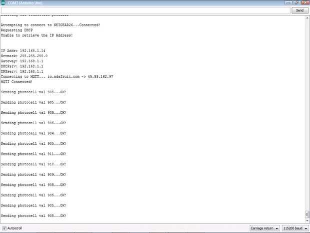 #include "Adafruit_SleepyDog.h" #include "Adafruit_CC3000.h" #include "SPI.h" #include "utility/debug.h" #include "Adafruit_MQTT.h" #include "Adafruit_MQTT_CC3000.h"</p><p>int photocellPin = 0; // the cell and 10K pulldown are connected to a0</p><p>/*************************** CC3000 Pins ***********************************/</p><p>#define ADAFRUIT_CC3000_IRQ 3 // MUST be an interrupt pin! #define ADAFRUIT_CC3000_VBAT 5 // VBAT & CS can be any digital pins. #define ADAFRUIT_CC3000_CS 10 // Use hardware SPI for the remaining pins // On an UNO, SCK = 13, MISO = 12, and MOSI = 11</p><p>/************************* WiFi Access Point *********************************/</p><p>#define WLAN_SSID "---YOUR WIFI SSID (NAME)---" // can't be longer than 32 characters! #define WLAN_PASS "---YOUR WIFI PASSWORD---" #define WLAN_SECURITY WLAN_SEC_WPA2 // Can be: WLAN_SEC_UNSEC, WLAN_SEC_WEP, // WLAN_SEC_WPA or WLAN_SEC_WPA2</p><p>/************************* Adafruit.io Setup *********************************/</p><p>#define AIO_SERVER "io.adafruit.com" #define AIO_SERVERPORT 1883 #define AIO_USERNAME "---YOUR ADAFRUIT USERNAME---" #define AIO_KEY "YOUR DASHBOARDS ADAFRUIT KEY" // it's the yellow square with the key icon on your dashboard</p><p>/************ Global State (you don't need to change this!) ******************</p><p>/ Setup the main CC3000 class, just like a normal CC3000 sketch. Adafruit_CC3000 cc3000 = Adafruit_CC3000(ADAFRUIT_CC3000_CS, ADAFRUIT_CC3000_IRQ, ADAFRUIT_CC3000_VBAT);</p><p>// Store the MQTT server, username, and password in flash memory. // This is required for using the Adafruit MQTT library. const char MQTT_SERVER[] PROGMEM = AIO_SERVER; const char MQTT_USERNAME[] PROGMEM = AIO_USERNAME; const char MQTT_PASSWORD[] PROGMEM = AIO_KEY;</p><p>// Setup the CC3000 MQTT class by passing in the CC3000 class and MQTT server and login details. Adafruit_MQTT_CC3000 mqtt(&cc3000, MQTT_SERVER, AIO_SERVERPORT, MQTT_USERNAME, MQTT_PASSWORD);</p><p>// You don't need to change anything below this line! #define halt(s) { Serial.println(F( s )); while(1); }</p><p>// CC3000connect is a helper function that sets up the CC3000 and connects to // the WiFi network. See the cc3000helper.cpp tab above for the source! boolean CC3000connect(const char* wlan_ssid, const char* wlan_pass, uint8_t wlan_security);</p><p>/****************************** Feeds ***************************************</p><p>/ Setup a feed called 'photocell' for publishing. // Notice MQTT paths for AIO follow the form: <username>/feeds/<feedname> const char PHOTOCELL_FEED[] PROGMEM = AIO_USERNAME "/feeds/photocell"; Adafruit_MQTT_Publish photocell = Adafruit_MQTT_Publish(&mqtt, PHOTOCELL_FEED);</feedname></username></p><p>/*************************** Sketch Code ************************************/</p><p>void setup() { Serial.begin(115200);</p><p> Serial.println(F("Adafruit MQTT demo"));</p><p> Serial.print(F("Free RAM: ")); Serial.println(getFreeRam(), DEC);</p><p> // Initialise the CC3000 module Serial.print(F("\nInit the CC3000...")); if (!cc3000.begin()) halt("Failed");</p><p> mqtt.subscribe(&onoffbutton);</p><p> while (! CC3000connect(WLAN_SSID, WLAN_PASS, WLAN_SECURITY)) { Serial.println(F("Retrying WiFi")); delay(1000); } } uint32_t x = analogRead(photocellPin); // This is important! This part took me forever to figure out.</p><p>// You NEED the "uint32_t x =" part if you plan on trying to add a different sensor, then just follow "x" through </p><p>// the rest of the code</p><p>void loop() { x = analogRead(photocellPin); // Make sure to reset watchdog every loop iteration! Watchdog.reset();</p><p> // Ensure the connection to the MQTT server is alive (this will make the first // connection and automatically reconnect when disconnected). See the MQTT_connect // function definition further below. MQTT_connect();</p><p> // this is our 'wait for incoming subscription packets' busy subloop Adafruit_MQTT_Subscribe *subscription; while ((subscription = mqtt.readSubscription(1000))) { if (subscription == &onoffbutton) { Serial.print(F("Got: ")); Serial.println((char *)onoffbutton.lastread); } }</p><p> // Now we can publish stuff! Serial.print(F("\nSending photocell val ")); Serial.print(x); Serial.print("..."); if (! photocell.publish(x)) { Serial.println(F("Failed")); } else { Serial.println(F("OK!")); }</p><p> // ping the server to keep the mqtt connection alive if(! mqtt.ping()) { Serial.println(F("MQTT Ping failed.")); }</p><p>}</p><p>// Function to connect and reconnect as necessary to the MQTT server. // Should be called in the loop function and it will take care if connecting. void MQTT_connect() { int8_t ret;</p><p> // Stop if already connected. if (mqtt.connected()) { return; }</p><p> Serial.print("Connecting to MQTT... ");</p><p> while ((ret = mqtt.connect()) != 0) { // connect will return 0 for connected Serial.println(mqtt.connectErrorString(ret)); if (ret < 0) CC3000connect(WLAN_SSID, WLAN_PASS, WLAN_SECURITY); // y0w, lets connect to wifi again Serial.println("Retrying MQTT connection in 5 seconds..."); mqtt.disconnect(); delay(5000); // wait 5 seconds } Serial.println("MQTT Connected!"); }