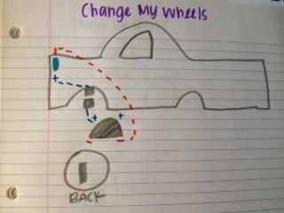 Usé Velcro conductor y ponerlo donde las ruedas sería normalmente en un camión. Cada vez que las ruedas están conectadas al carro, el interruptor funciona y el coche encienden luces. Mi línea positiva va desde el positivo en el LED hasta un cuadrado del Velcro conductor entonces comienza por la otra plaza de Velcro conductor hasta el positivo en el portabaterías. La línea negativa va desde el negativo en el recto hasta la negativa de LED en el portabaterías.