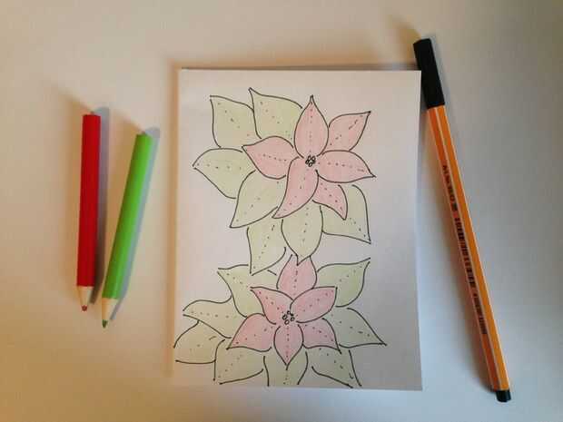 Hemos bosquejado una planta de poinsettia utilizando lápices de colores rojos y verdes. Plan de tener dos áreas de su diseño iluminan desde atrás - a iluminar los centros de las flores utilizando LEDs de color rojo.