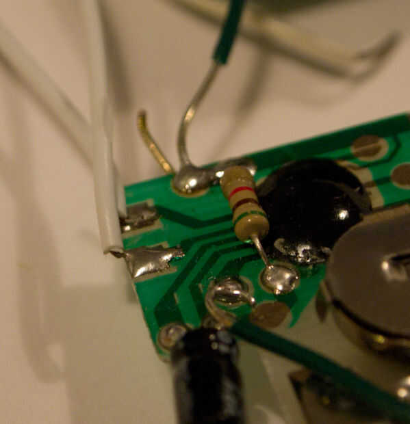 Tomar dos trozos de cable y los extremos de la tira. Puesto que hay no hay almohadillas de soldadura en la parte inferior del tablero del circuito, tenemos que asegúrese de que ha expuesto alambre sobre el tablero donde están las almohadillas.