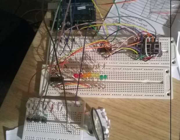Empecé con los registros de cambio y consiguió ésos trabajo como los son vinculados para que utilizo solo 3 pines del Arduino Uno. Uno controla los displays de 7 segmentos usando multiplexación con los transistores de NPN, esto permite el cambio rápido entre el 3 segmento engañando tus ojos en los 3 están en el pensamiento. El otro controla los LEDs con un cambio sencillo.