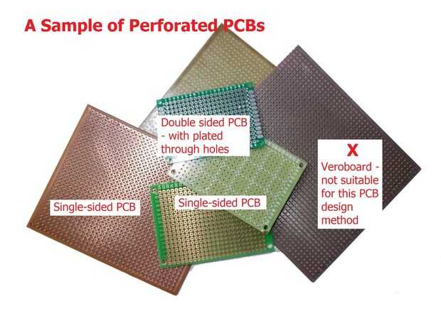 - Este método de diseño es adecuado para todo tipo de 0,1" perfboard excepto Veroboard (ver las muestras en la primera foto).