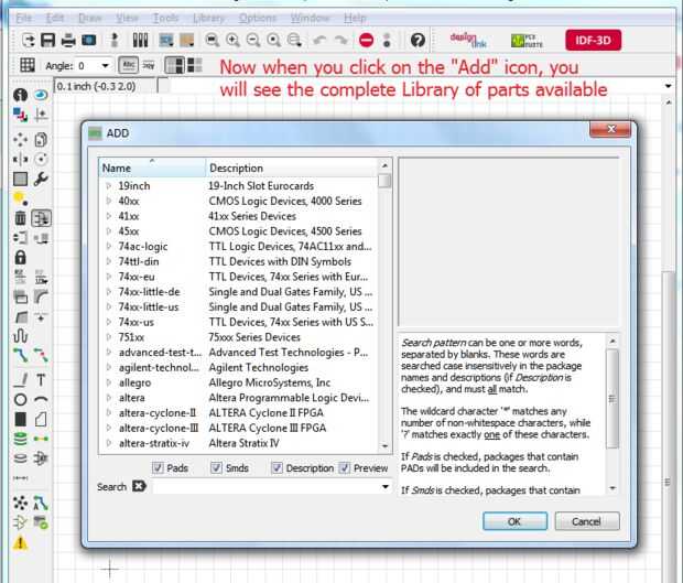 Al hacer clic en el botón Agregar que se muestra en la imagen, debe subir una lista de nombres de biblioteca. Clic en la flecha a la izquierda del nombre de la biblioteca luego gotas abajo en la lista de los componentes dentro de la cual usted puede elegir lo que usted necesita para su diseño.