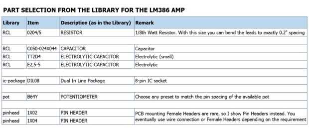 He adjuntado una tabla (segunda foto) para mostrar que las bibliotecas utiliza y los componentes que he seleccionado de cada biblioteca. Las bibliotecas mencionadas contienen componentes que se usan para la mayoría PCB diseños, audio y digital, así que puede ahorrar esta tabla como guía para futuros diseños de PCB. Explorar otras bibliotecas, descargar los personalizados o hacer tu propio como usted familiarizarse con águila.