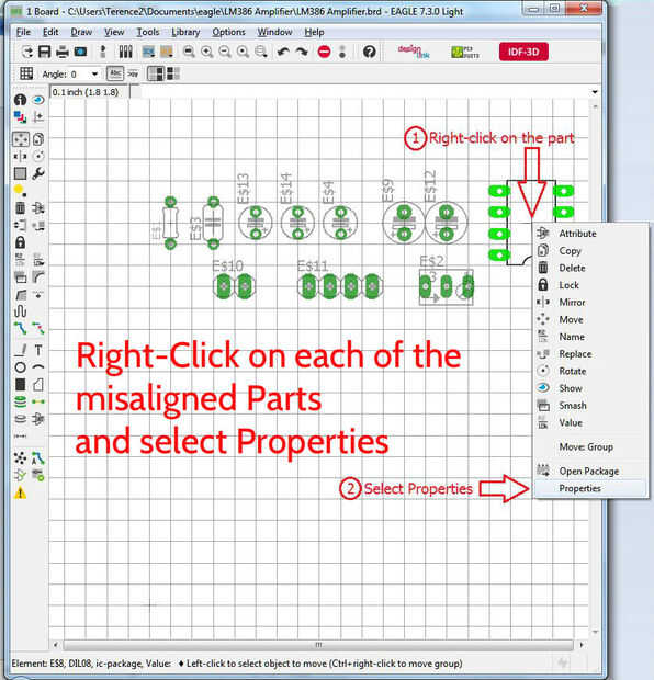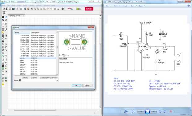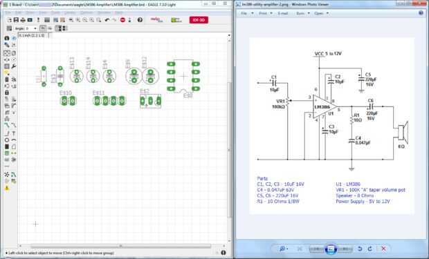 - Haga clic en la flecha a la izquierda de los proyectos, luego águila, entonces el Amplificador LM386.