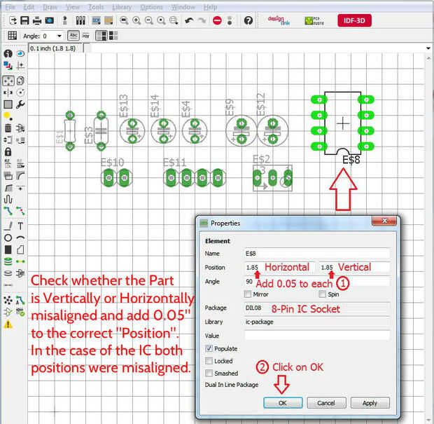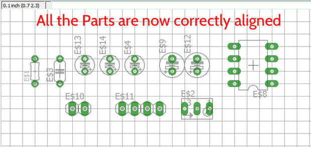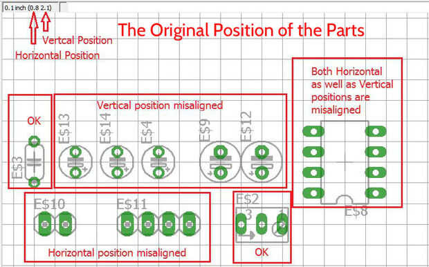 - Reubicar los componentes a la red de 0,1": para conectar un componente a otro, sus puntos de conexión deben corresponder a los puntos de cruce de las líneas horizontales y verticales de la cuadrícula. Sin embargo cuando se les toma de la biblioteca, sus conductores no siempre correspondan a la red como sea necesario. Para los cuadros 4 a 7, he hecho las líneas de cuadrícula más oscuro para que pueda ver lo que quiero decir. Por favor siga las instrucciones en los cuadros para corregir la posición de los componentes. Hay otras maneras de hacerlo, pero esta es la forma más fácil. Lamentablemente tienes que hacer cada uno individualmente... no hay atajo!