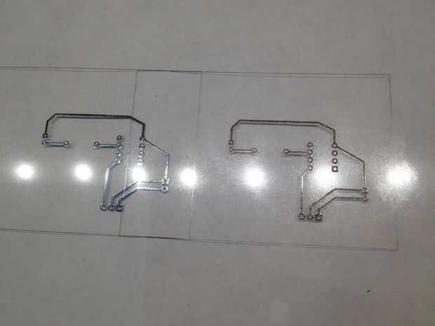 Nota: El circuito se volverá oro en color, si bien forma un rastro de la conductora. Si queda plata entonces no será un conductor. Si se seca la plata podría significar que el ambiente es demasiado seco. Si no encuentra un ambiente húmedo, los circuitos se pueden todavía imprimir usando un método simple"huella digital". Varias veces manchar los dedos sobre la transparencia en la ubicación que se imprimirá el circuito. El aceite de su piel será suficiente para hacer el circuito conductor cuando se imprime en la parte superior del.