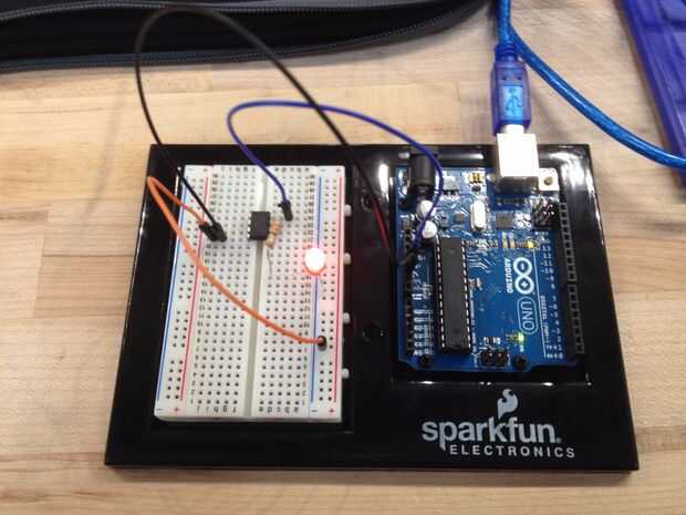 Primero se realizó un prototipo del circuito deseado usando un protoboard y un Arduino. El código es sólo una versión modificada del ejemplo "Parpadear". El código fue subido a la ATtiny85 que más tarde se instalará en el circuito impreso. Para aprender a subir el código a un ATtiny con un Arduino, echa un vistazo en mi profundidad tutorial aquí.