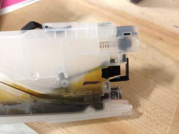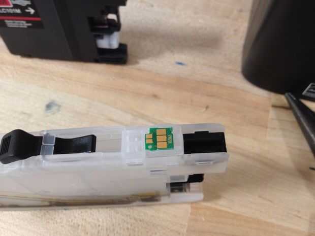 La impresora mide el nivel de tinta de los cartuchos de dos maneras; visualmente y matemáticamente. Para la primera razón se recomienda colocar algunos negro, cinta aisladora alrededor de la pequeña ventana en la parte posterior del cartucho (se muestra en la imagen de arriba). Esta ventana trasera es lo que mira la impresora para ver si hay tinta en los cartuchos. Costaría una gran cantidad de dinero por rellenar cada cartucho con la tinta conductora por lo que esto ayuda a engañar a la impresora en el pensamiento de están llenos. Cada cartucho viene también con un pequeño chip en la parte superior de él. Si la impresora dice que se está ejecutando bajo en tinta (tratará de calcular cuanta tinta ha utilizado), simplemente quite y vuelva a insertar el cartucho y el chip se restablecerá. Cuando el chip se reinicia informará el equipo que ha insertado un cartucho de"nuevo".
