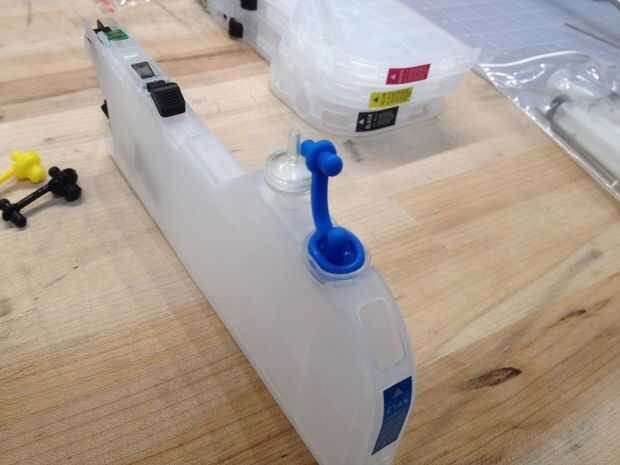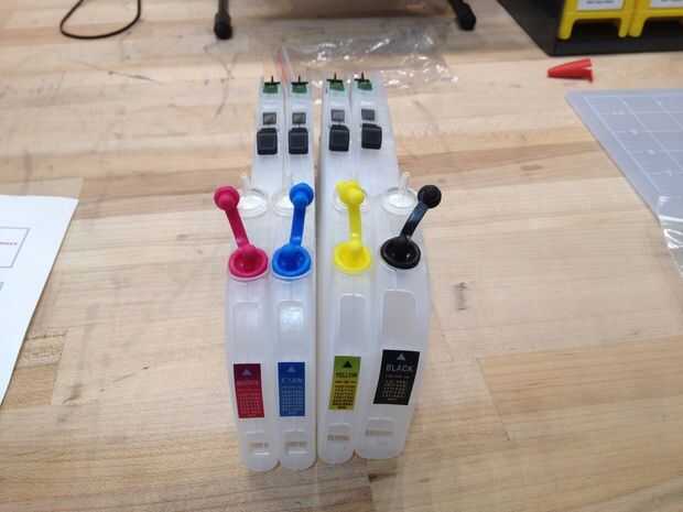 La primera cosa a hacer es instalar los filtros de aire suministrado en la parte superior de los cartuchos. Cartuchos de tinta tienen este orificio para que el vacío no está formado dentro del contenedor cuando se extraer la tinta. Normalmente los cartuchos no necesitan un filtro, porque están completamente encerrados en la impresora. Sin embargo, después de tener los cartuchos de tinta y desactivar la advertencia de "puerta abierta" con la bisagra proporcionada se extienden más allá del chasis de la impresora, estos se recomiendan para evitar que los residuos contaminen su tinta.