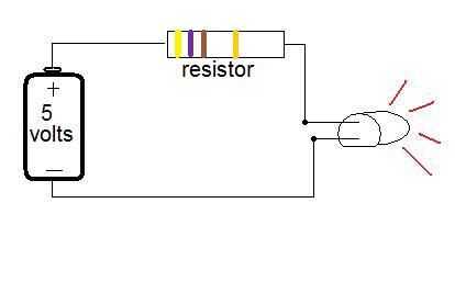 5. el esquema se muestra en la imagen. Es muy simples solo 5 voltios (representados por una batería) conectadas a un resistor y la resistencia para el LED y la pata corta del LED (que también tiene un lugar plano) está conectada a tierra. La resistencia es una resistencia de 470 ohm por lo que las bandas de colores amarillo, morado, marrón, oro.