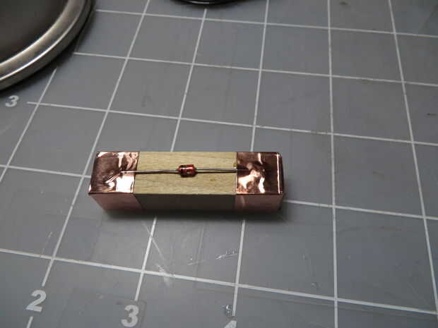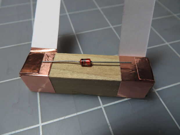 • El componente fue colocado para que los conductores estaban descansando en cada extremo de la cinta de cobre. Asegúrese de está sentado en ambos trozos de cinta de cobre y dos piezas de cobre cinta son accesibles.