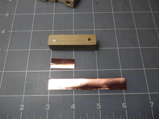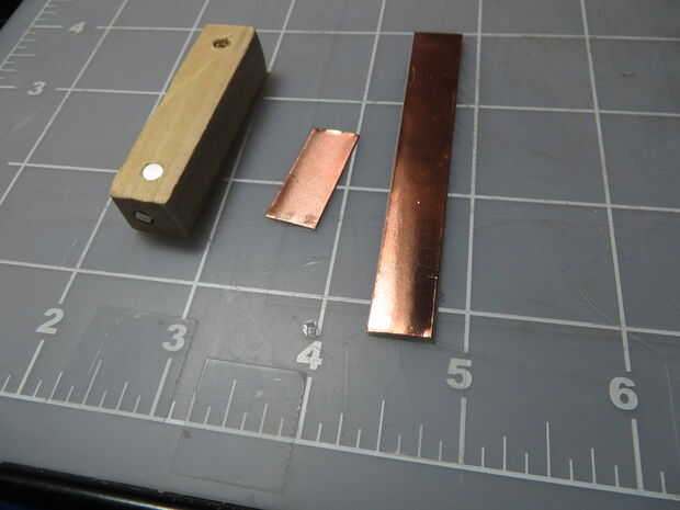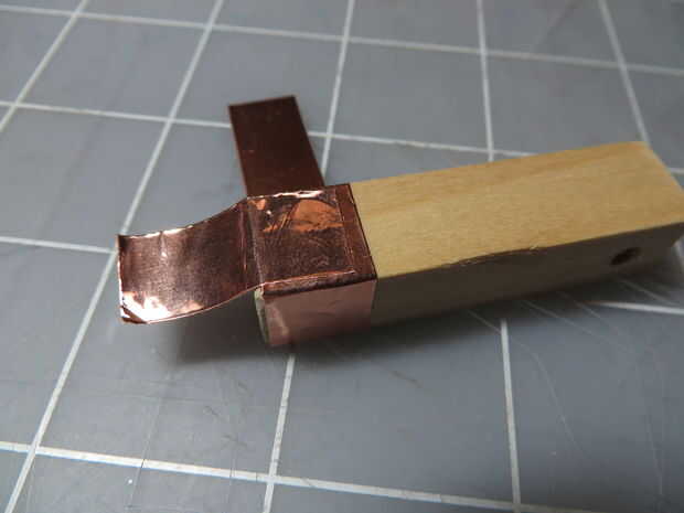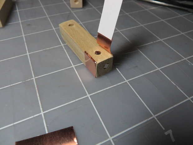 • Cortar dos tiras de cinta de cobre. Ver las dos primeras imágenes para las longitudes que utiliza.