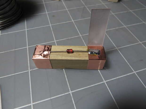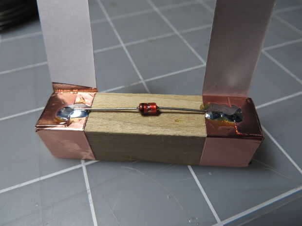 • Un cable del componente de ambos trozos de cinta de cobre de la soldadura. Esto asegura que ambas piezas de cinta de cobre están conectados eléctricamente al componente. Luego hacer lo mismo para el otro cable.