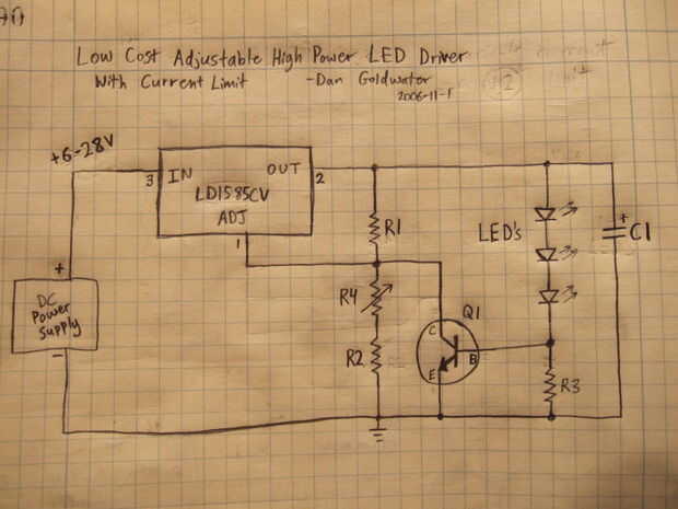 Este circuito le permite ajustar la tensión en el LED a cualquier valor usando un dial o un regulador, pero también limita el LED actual como antes para que no gire el selector del punto seguro.