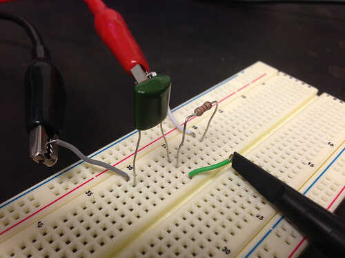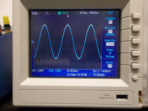 La pinza cocodrilo roja lleva la señal de entrada (de un generador de funciones) llevar la pinza negra a tierra y el cable verde lleva la señal de salida, que enviamos a un osciloscopio para la prueba. Como pasamos de señales de baja frecuencia para señales de alta frecuencia, el resultado que se lee en nuestro osciloscopio parecía esto: